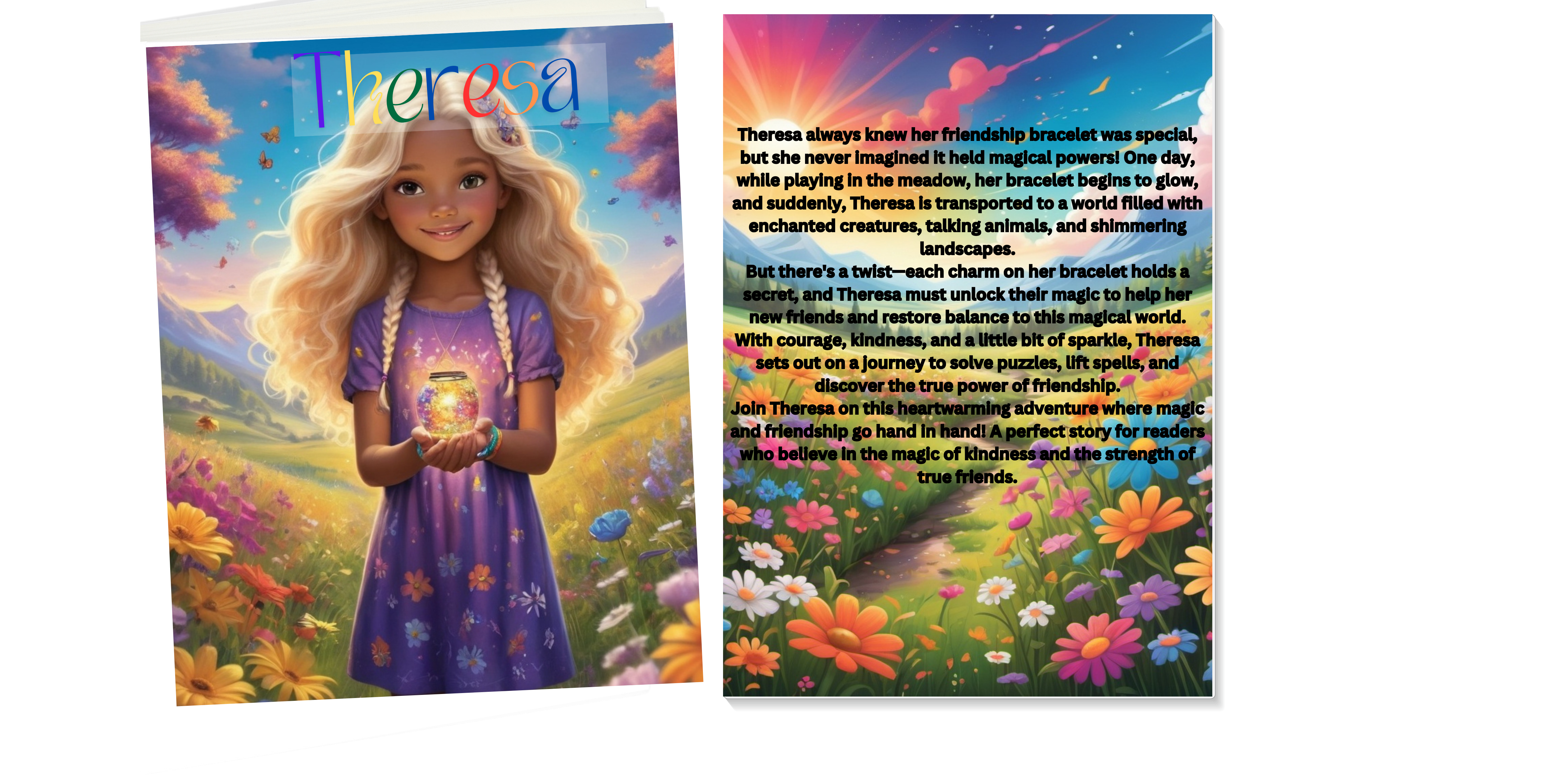 Theresa always knew her friendship bracelet was special, but she never imagined it held magical powers! One day, while playing in the meadow, her bracelet begins to glow, and suddenly, Theresa is transported to a world filled with enchanted creatures, talking animals, and shimmering landscapes. But there’s a twist—each charm on her bracelet holds a secret, and Theresa must unlock their magic to help her new friends and restore balance to this magical world. With courage, kindness, and a little bit of sparkle, Theresa sets out on a journey to solve puzzles, lift spells, and discover the true power of friendship. Join Theresa on this heartwarming adventure where magic and friendship go hand in hand! A perfect story for readers who believe in the magic of kindness and the strength of true friends.